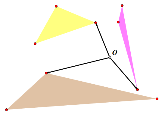 每一个不包含原点的三角形——无论形状多么畸形,位置多么奇特,总会被计入统计一次且只有一次。下面展示了几个三角形,和它们被计入统计时,扫描线a的位置: