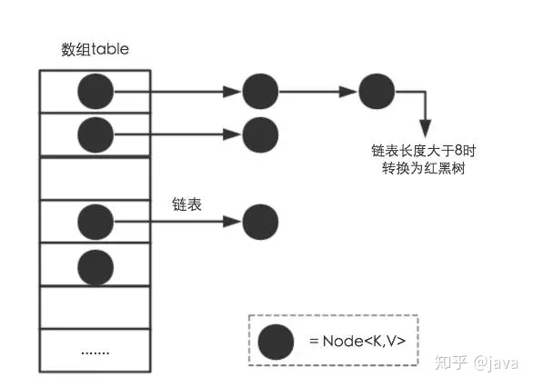 transient Node<K,V>[] table:这是一个Node类型的数组(也有称作Hash桶),可以从下面源码中看到静态内部类Node在这边可以看做就是一个节点,多个Node节点构成链表,当链表长度大于8的时候转换为红黑树。