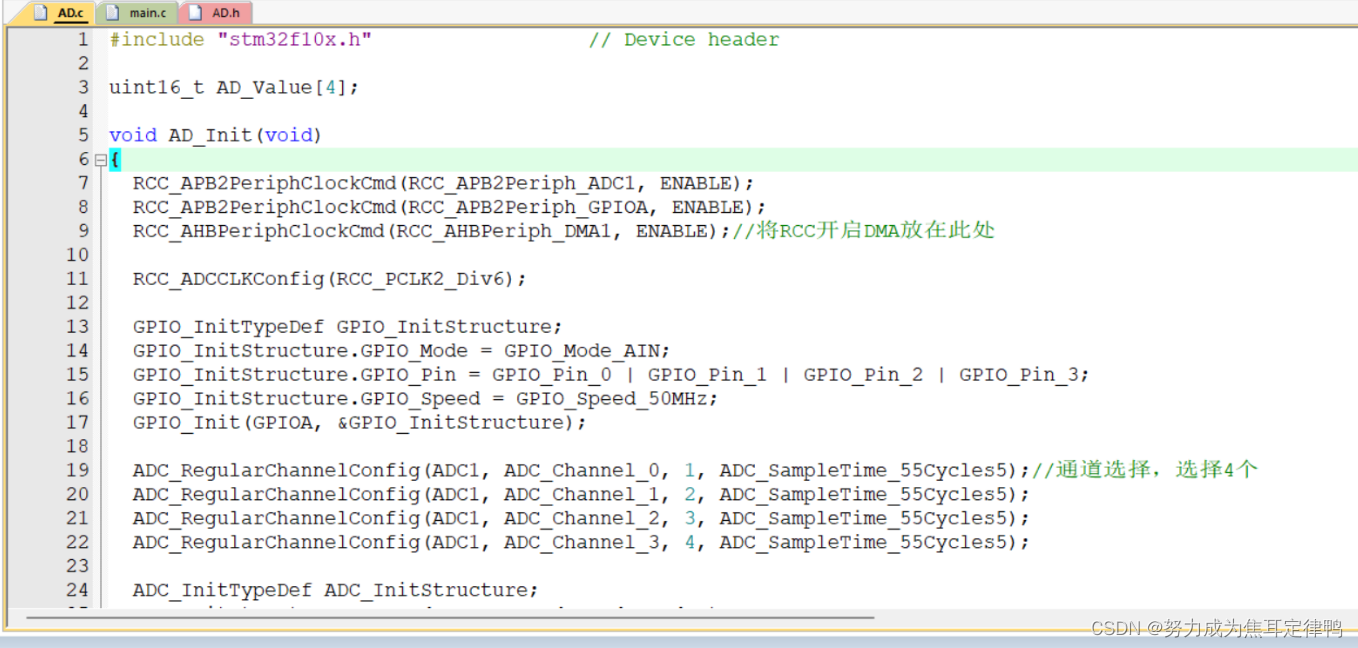 代码总逻辑:将AD多通道代码和DMA转运部分代码结合起来,修改参数,即可完成AD+DMA转运