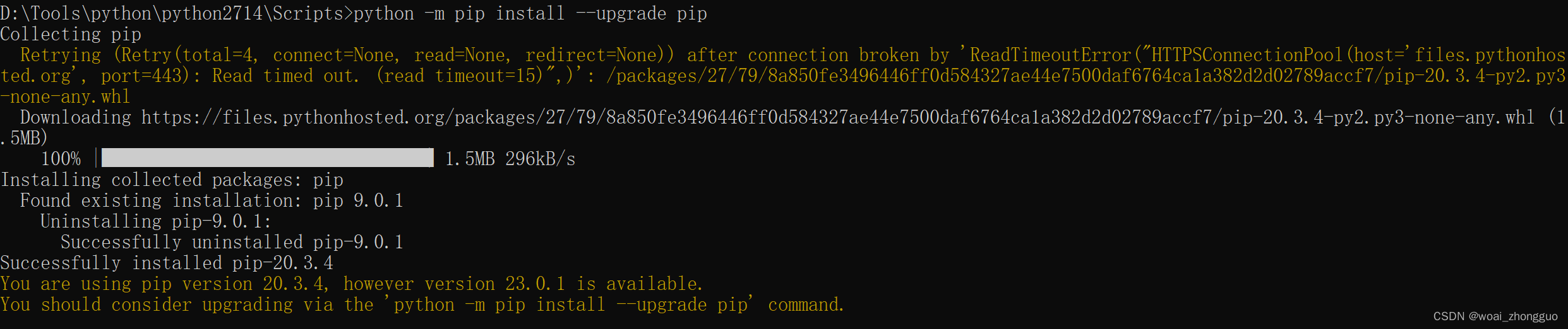 当使用python2.7的pip安装某个依赖包时发现提示需要更新pip,好,那就更新,输入命令: