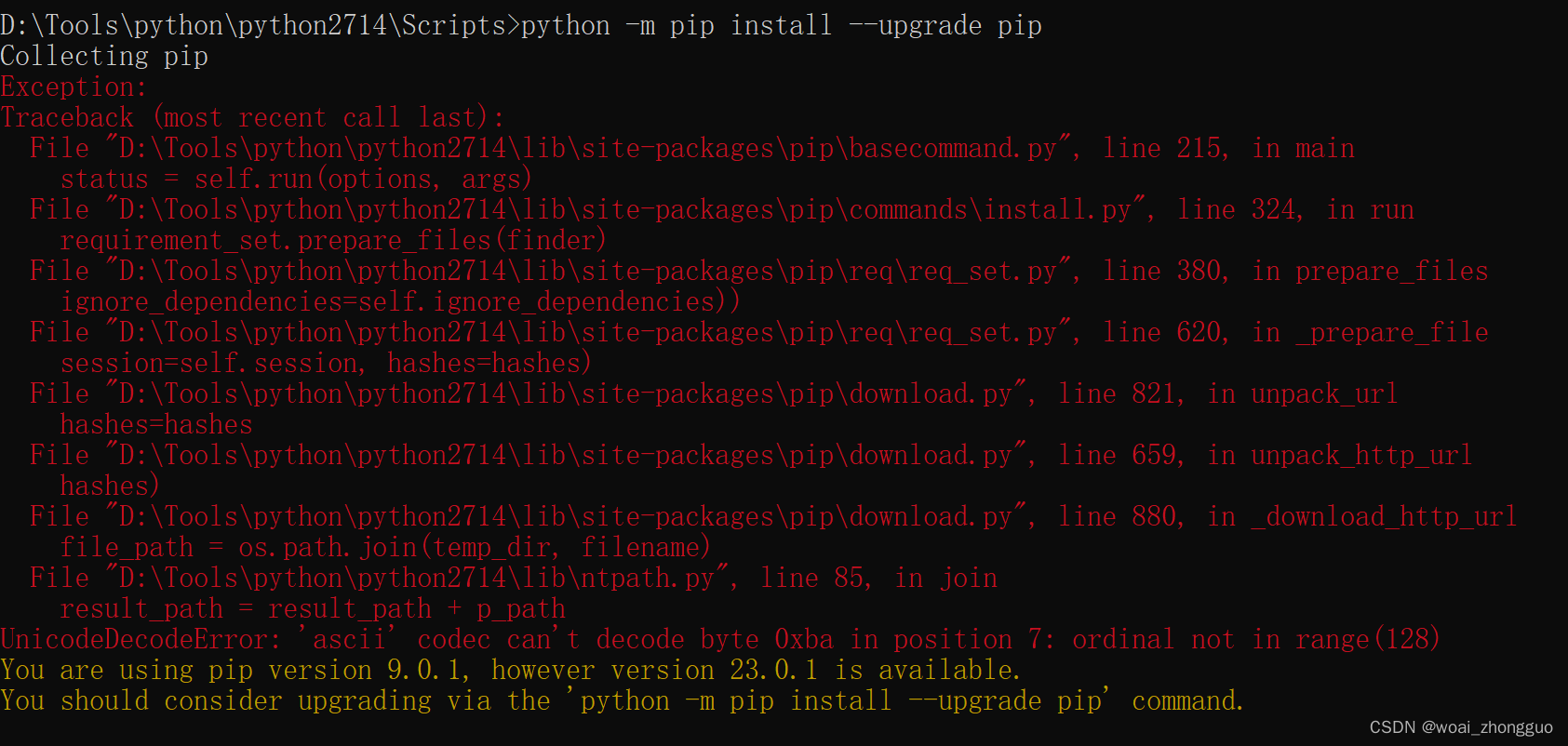 在尝试更新pip时遇到UnicodeDecodeError,问题源于文件路径含有非ASCII字符。通过临时修改系统编码为GBK可以解决当前问题,但这种方法可能引发其他编码警告。建议避免在路径中使用汉字以防止类似问题。