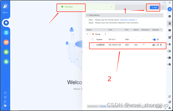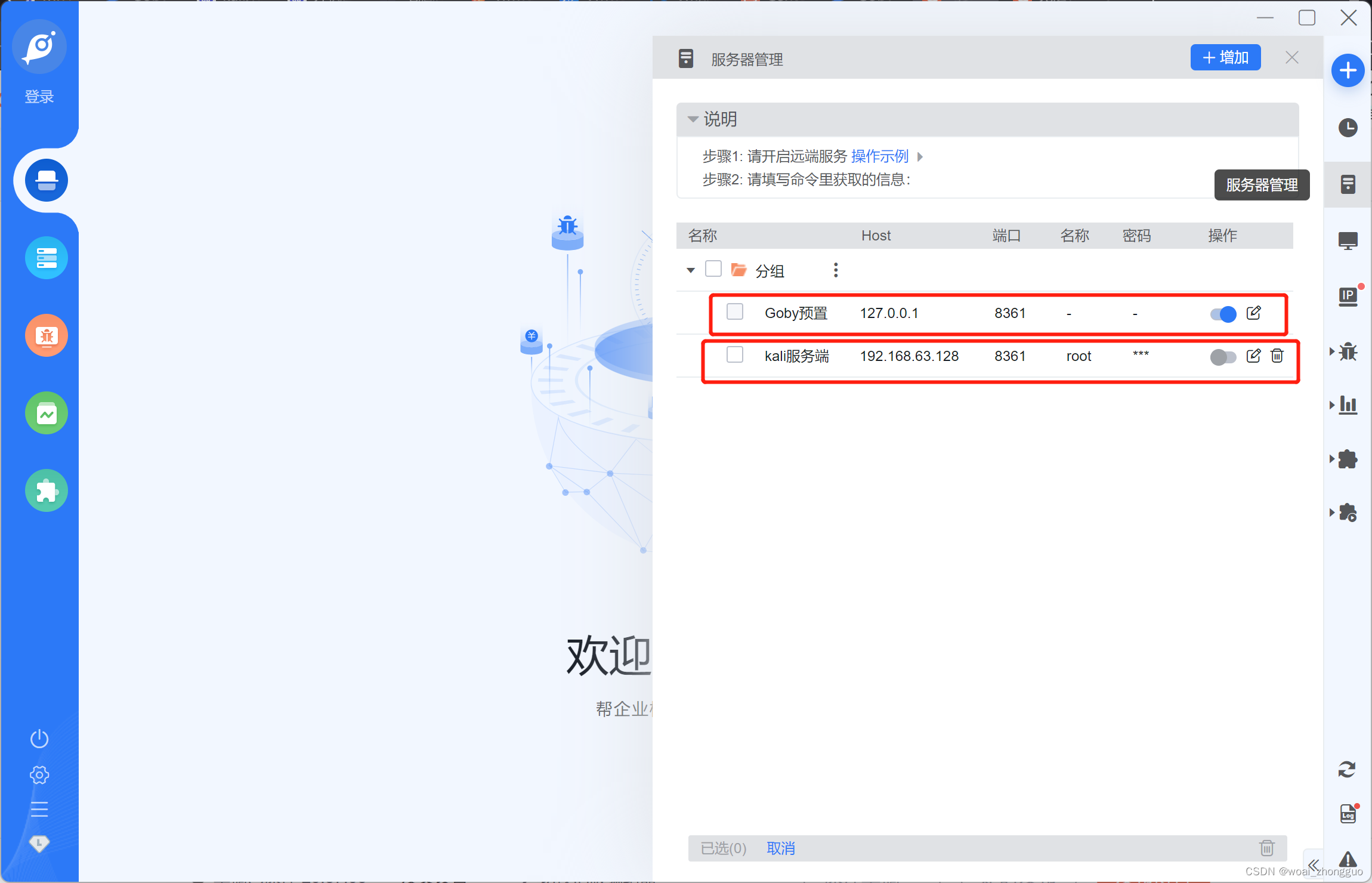 需要在windows的图形化界面添加linux的goby作为服务端提供服务,如下图操作