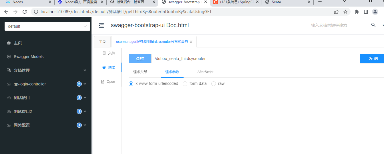 http://localhost:10085/doc.html#/default/测试接口/getThirdSysRouterInDubboBySeataUsingGET