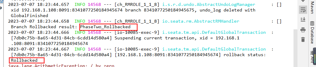 // 执照异常,利用分布式事务回滚 int i = 100 / 0;