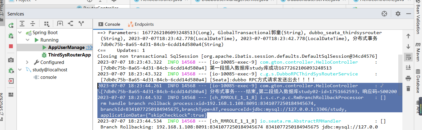 2023-07-07 18:23:43.322 INFO 14568 --- [io-10085-exec-9] c.g.s.DubboRPCThirdSysRouterService : [7db0c75b-8a65-4d31-84cb-6cdd14d580a4] [Seata]:dubbo RPC方式请求发送出去!!!!
