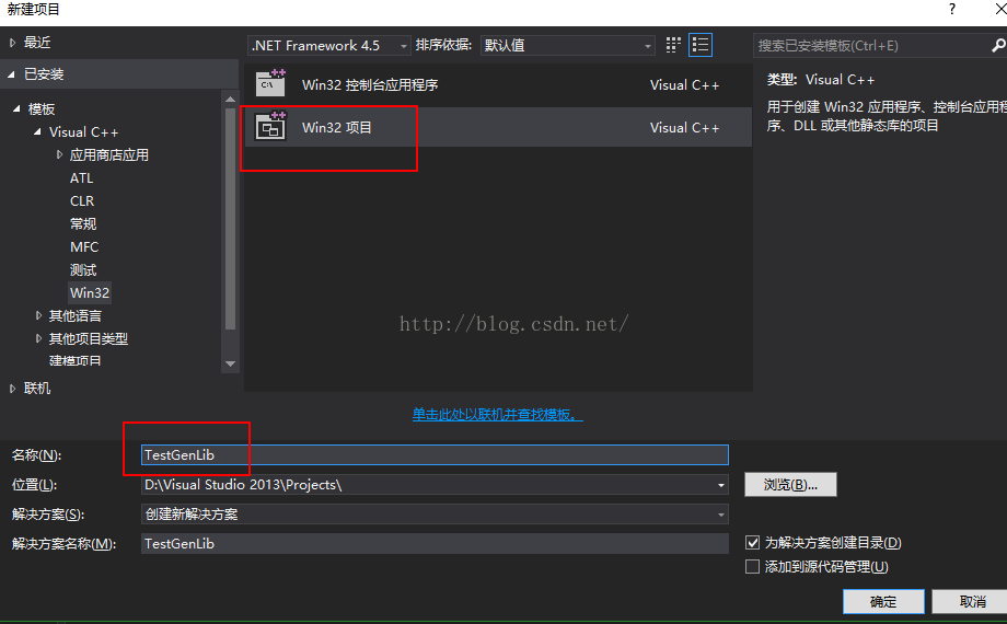 打开VS,文件->新建->项目,选择“Win32项目”(备注:其实这里选择“Win32控制台应用程序”也是一样的,因为下一步才是具体的选择你的项目是什么类型,即使退一万步说你现在选错了,后面仍然可以更改,这个后面补充说明),