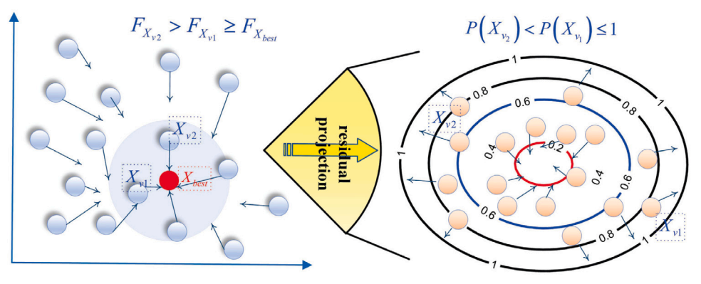 在残差引导投影(Residual Guided Projection, RGP)过程中,算法通过在多维空间中不断投影来逼近最优解。将 Kaczmarz 行动逐行迭代更新策略与随机梯度下降(SGD)相结合,建立了一个协同混合框架,为高维解空间中的轨迹提供系统性指导。基于残差思想,在每次迭代选择投影方程时加入了随机梯度的理念。具体来说,通过比较随机数 和 ,RGP 决定采用“随机”或“最优”选择策略。该决策过程具有概率性质,从而增强了算法的探索性。在 RGP 中,随机选取两个残差适应度较小的最优解粒子或样本( 和 )作为引导代理,并基于该代理计算梯度以指导投影方向。这样,解的更新不仅依赖于当前解的投影,还基于梯度加速收敛并避免陷入局部最优。其数学表达式如下: