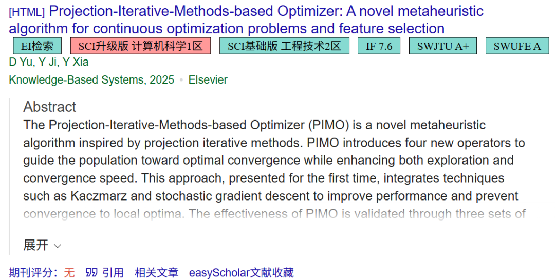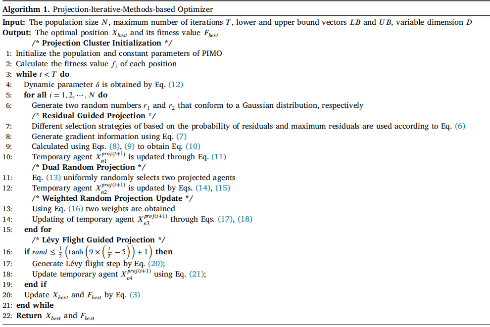 [1] Yu D, Ji Y, Xia Y. Projection-Iterative-Methods-based Optimizer: A novel metaheuristic algorithm for continuous optimization problems and feature selection[J]. Knowledge-Based Systems, 2025: 113978.