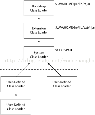 除了引导类加载器之外,所有的类加载器都有一个父类加载器。通过 表 1中给出的 getParent()方法可以得到。对于系统提供的类加载器来说,系统类加载器的父类加载器是扩展类加载器,而扩展类加载器的父类加载器是引导类加载器;对于开发人员编写的类加载器来说,其父类加载器是加载此类加载器 Java 类的类加载器。因为类加载器 Java 类如同其它的 Java 类一样,也是要由类加载器来加载的。一般来说,开发人员编写的类加载器的父类加载器是系统类加载器。类加载器通过这种方式组织起来,形成树状结构。树的根节点就是引导类加载器。图 1中给出了一个典型的类加载器树状组织结构示意图,其中的箭头指向的是父类加载器。