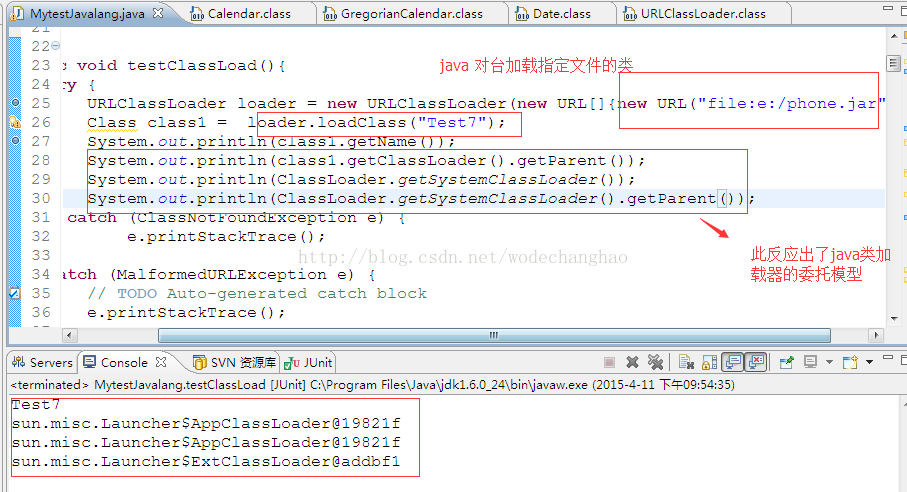 当调用其中一个方法的时候,指定的类(以类名为参数)由类装入器装入。如果类已经装入,那么只是返回一个引用;否则,装入器会通过委托模型装入类。