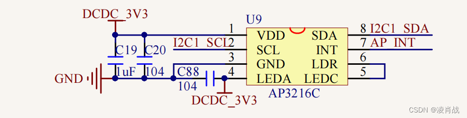 上图可以看出,AP3216C使用的 I2C1控制器,除了 I2C的这两条线外,还有一个AP_INT接口,这是个中断接口。本实验不用这个中断功能。