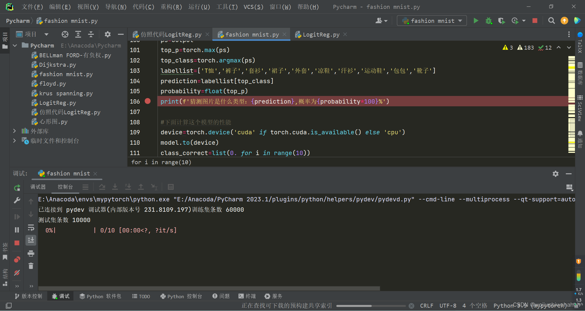 pycharm断点调试 3.如果运行到某一行,你想要观察这一行的代码调用的函数中,各种变量都发生了什么变化,则step into 就跳转到我所引用的函数里面去,如果函数中存在子函数,那么不会显示子函数变量的信息,会将子函数执行完以后再返回变量的信息。2.接下来适用step over键,可以逐行运行,观察每一行的代码中数据都发生了什么。5.如果想要跳出函数的话step out。1.设置断点,代码运行到第105行停止。4.接着使用step over逐行跳转。