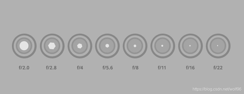 通常称为f-number(N),透镜的焦距(f)与孔径(D)的比,N= f/d。孔径越大,进入相机的光线就越多。