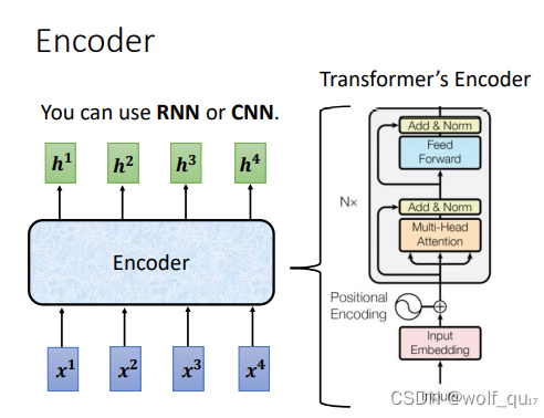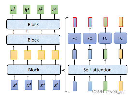 Encoder就是通过多层block(模块),将输入转换成向量。每一个block又包括self-attention和fully connect等网络结构。