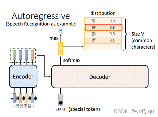 decoder:接受encoder输出的向量,逐步解码,一次输出一个结果,每次输出会影响下一次的输出,开头加入<BOS>表示开始解码,<EOS>表示输出结束。