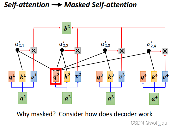在decoder里面使用masked self-attention的原因是一个接一个输入,输入了a1才会产生b1即a2,所以在计算b1的时候还没有a2、a3、a4。