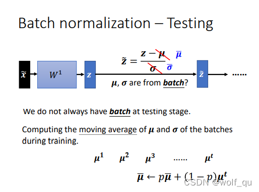 测试过程中由于没有batch,因此我们无法计算均值和方差,在此我们可以采用训练过程中的均值和方差,将训练过程中所有batch的μ和σ都保存下来,然后按权重求和得到用于testing的μ和σ。