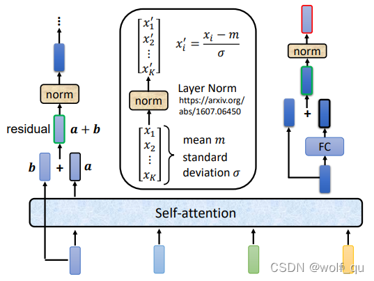 考虑所有输入向量后的输出向量,b是原来的输入向量,经过残差网络和标准化后,送到完全连接神经网络,再经过残差网络和标准化后得到输出