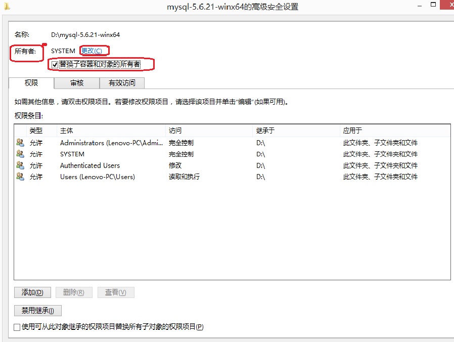 因为这里的mysql软件目录放置在D盘的,一般C盘的权限是最高的SYSTEM,而D盘的权限,