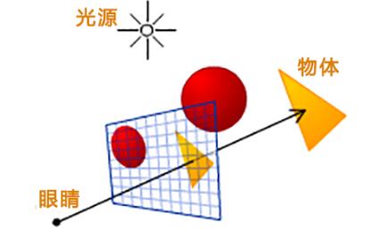 屏幕上的每个象素渲染的时候,就是从虚拟的眼睛开始做一条射线通过所要渲染的像素,这条射线和屏幕里面的三维空间交汇在哪里(另一种说法射中哪个位置),像素就渲染那个位置的颜色。
