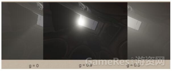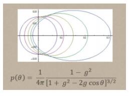 公式中的g值代表了介质散射性质,图中显示了不同g值对散射的影响。