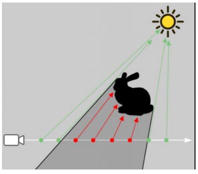 计算过程简单描述起来就是,连接采样点和光源点作一条线段,然后检测场景中这条线段有没有和别的可见物体相交。如果有交点就判定该采样点被阴影遮挡,不记入采样数据,反之正常计算。