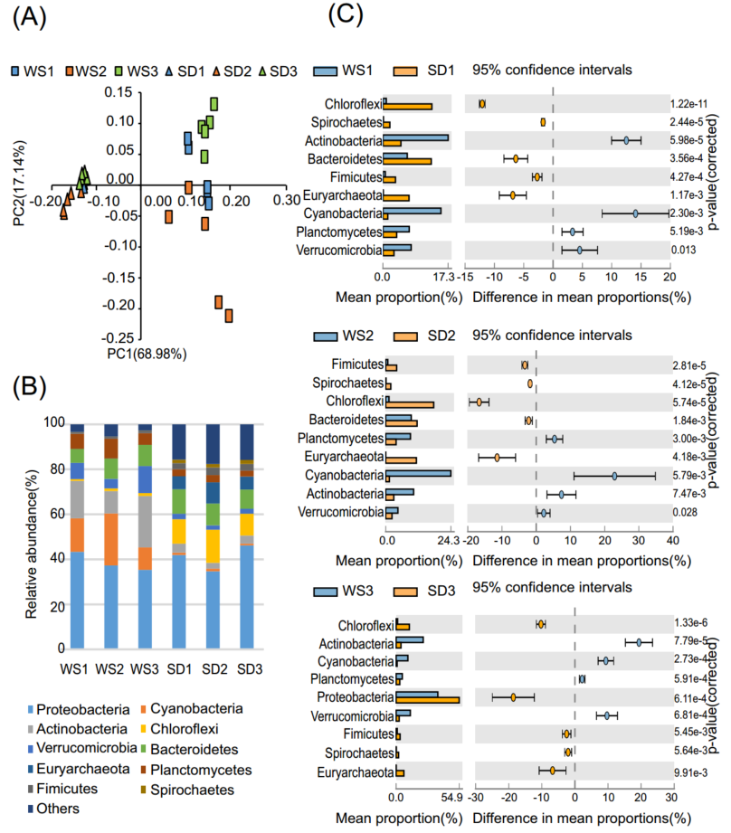除了胺类物质的利用以外(WS1和WS2水样不利用胺类),其他五种主要碳源都被水体和底泥微生物群落有效利用(图1A-F)。底泥微生物群落碳源利用的平均吸光值显著高于水体样品,底泥和水体样品微生物群落对碳源的利用表现处一定的协同,水体微生物群落的碳源利用率高,相应的底泥微生物群落的利用也高。水体样品更多的利用羧酸类(35.08%),多聚物类(24.91%)和碳水化合物类碳源(23.16%),底泥样品更倾向利用多聚物类(25.61%)和氨基酸类碳源(21.31%)(图1 G)。主成分分析显示水体和底泥对六类碳源的利用存在显著差异(图1 H)。热图分析表明底泥微生物群落偏好的碳源包括吐温80,吐温40, L-天冬氨酸, γ-羟基丁酸, L-苯基丙氨酸等,水体微生物群落偏好的碳源包括丙酮酸甲酯,N-乙酰-D-葡萄糖胺,衣康酸和纤维二糖等(图1I).