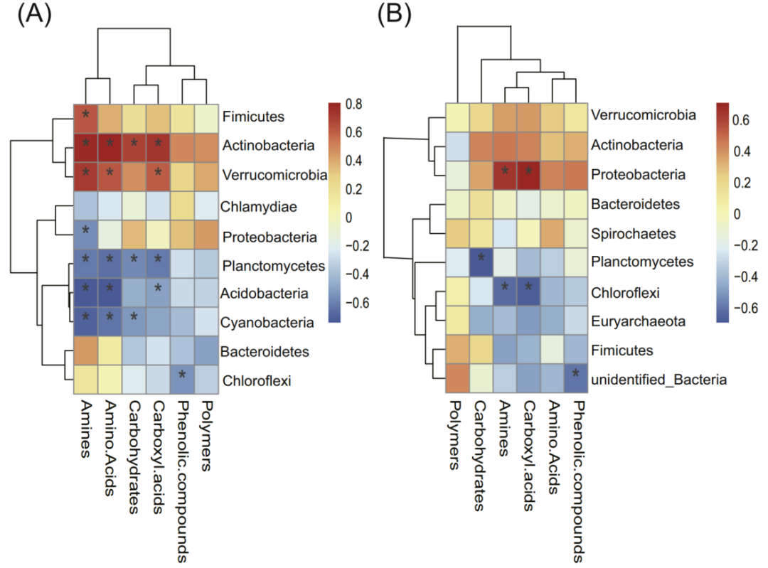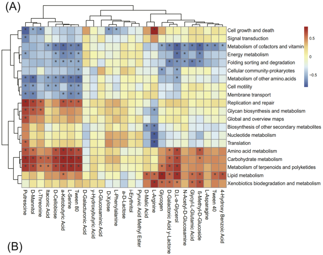 Mantel检测证实底泥微生物群落的代谢特性与level 1,level 2 and level 3水平的预测功能的相关性(R = 0.288, 0.3125, 0.3635; P = 0.0213, 0.0168, 0.0106)较水体样品(R = 0.102, 0.430, 0.489; P = 0.1024, 0.0008, 0.0002)低。图5展示了水样和底泥微生物群落基于Biolog Eco板的代谢特性和levle2水平前20种预测功能的相关性分析,其中碳水化合物代谢、萜类和聚酮化合物代谢、氨基酸代谢、脂类代谢、其他污染物的降解和代谢,以及复制和修复等预测功能与Biolog Eco板的碳源利用显著正相关,而辅酶因子和维生素代谢,折叠、排序和降解,能量代谢,其他氨基酸代谢和细胞移动等预测功能与Biolog Eco板的碳源利用显著负相关。底泥样品微生物群落的各预测功能包括外源物质降解和代谢、原核细胞群落、细胞移动和其他氨基酸代谢与Biolog Eco板的碳源利用显著正相关,而核酸代谢、次级代谢物的生物合成,复制和修复及翻译等预测功能与Biolog Eco板的碳源利用显著负相关。