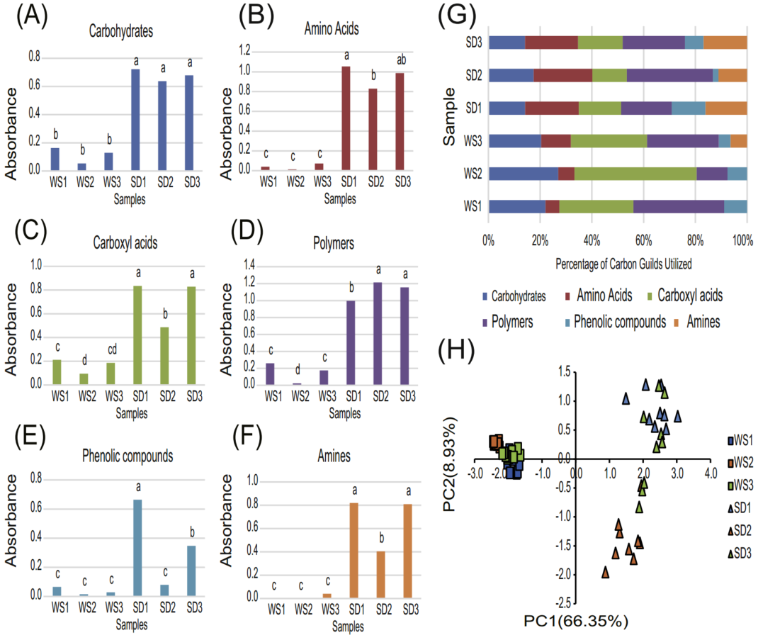 图1 基于Biolog Eco板的水样(WS1-WS3)和底泥(SD1-SD3)微生物群落的功能多样性