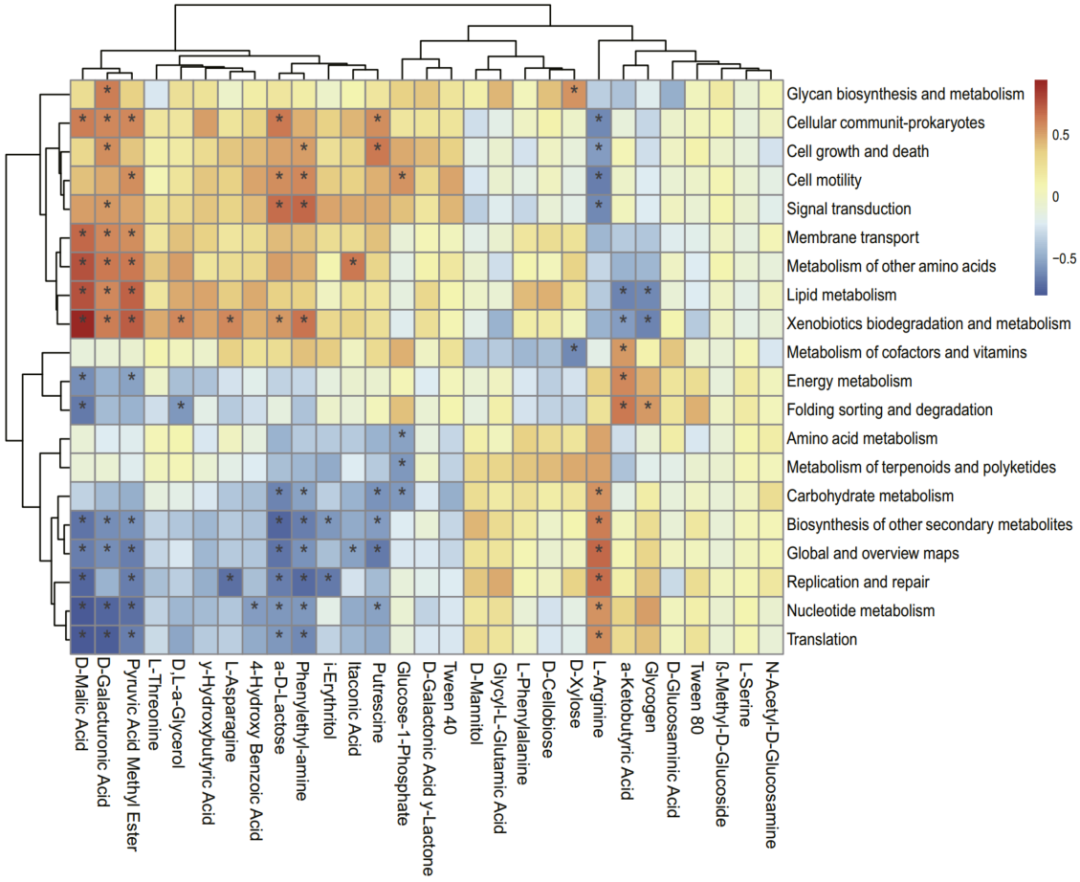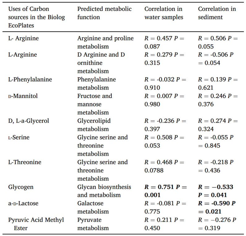 表1 基于Biolog Eco板的碳源利用与预测的相应物质代谢功能的相关性分析