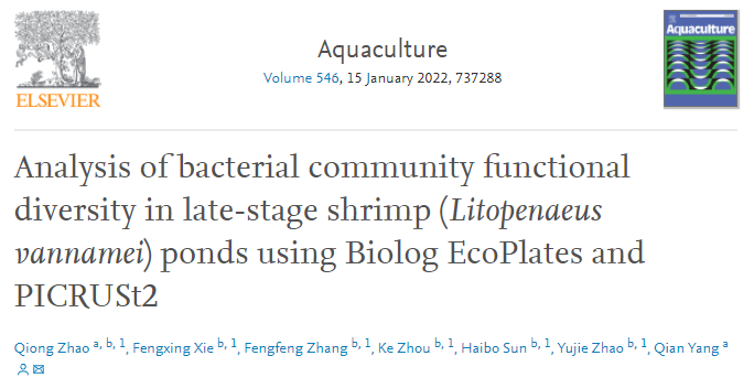 Qiong Zhao,Fengxing Xie,Fengfeng Zhang,Ke Zhou,Haibo Sun,Yujie Zhao & Qian Yang.Analysis of bacterial community functional diversity in late-stage shrimp (Litopenaeus vannamei) ponds using Biolog EcoPlates and PICRUSt2. Aquaculture(2021), doi: https://doi.org/10.1016/j.aquaculture.2021.737288