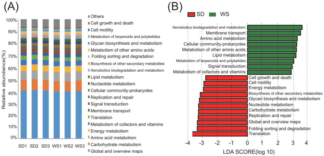 a 水体样品(WS1-WS3)和底泥样品(SD1-SD3) 前20种level 2水平预测功能的相对丰度;