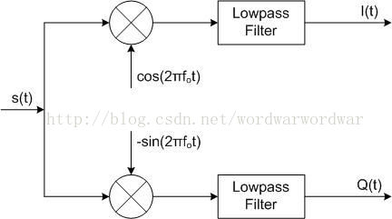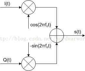 I(t)为同相支路(I路)的基带信号,Q(t)为正交支路(Q路)的基带信号。I路信号与载波 相乘,Q路信号与载波 相乘,然后将两路乘积加起来作为发送信号s(t),即