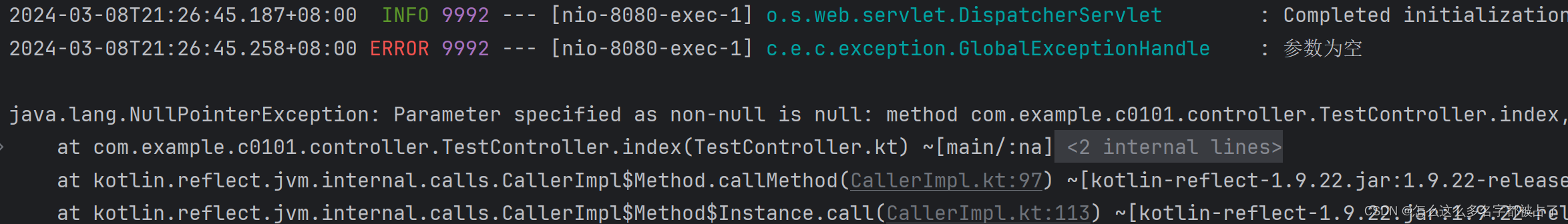 在/index的URI下,用户需要传入一个name参数,如果用户没有传入,则会触发空指针异常,调用我们之前写的异常处理类