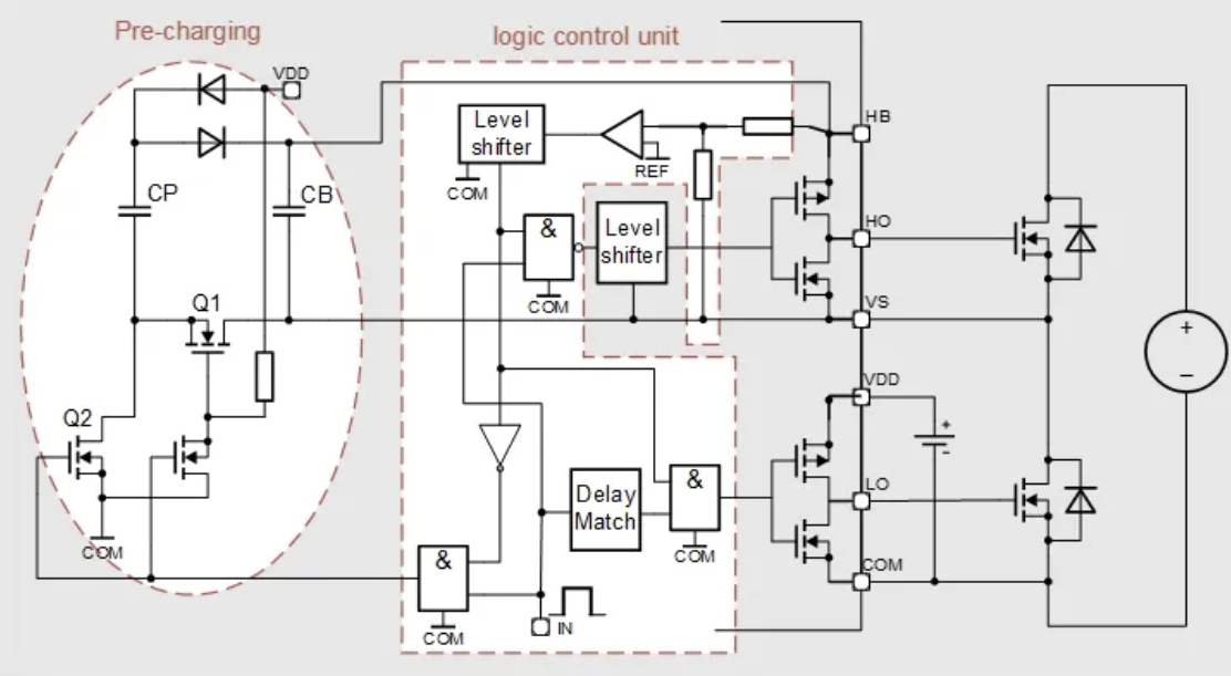 该单元可以激活或禁用预充电单元或者高边/低边驱动器。一旦高边/低边驱动器开始工作,预充电电路就会被禁用。控制机制通过监测高边驱动器的电源,当电压达到阈值水平(例如,对于Si FET为10V)时,比较器的输出从低电平变为高电平。电平移位器将电平参考点从浮动参考点VS变换为系统参考点COM,从而可以去控制以系统COM为参考点的逻辑电路。这个电路就是典型的欠压锁定电路(UVLO),在本文系统设计中,该欠压锁定电路的控制信号会同时去控制高边/低边驱动器还和预充电电路的使能,控制高边/低边驱动器的信号和控制预充电电路的信号是反相的,避免系统上电启动以后预冲电单元还在工作。此外,阈值水平应具有滞后范围,因为VCB在充电和放电之间存在纹波。滞后范围确保逻辑控制单元进行可靠控制。输入脉冲来自功率控制器或微控制器,通常是具有某种拓扑结构的典型脉冲宽度调制(PWM)信号。预充电电路可以使用与驱动器相同的脉冲进行预充电工作,也可以使用独立的脉冲进行充电,这在驱动器的PWM为高频率且占空比不确定时,对充电尤为灵活。