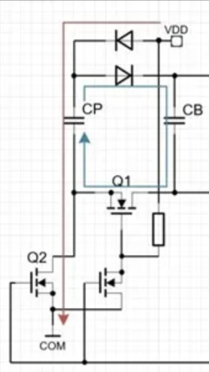 如红线所示,当Q2导通时,电容器(CP)由VDD充电并储存能量。随后,Q2关闭,Q1导通,CP放电并将其储存的能量转移到CB。CP和CB上的电压可以通过方程进行检测。