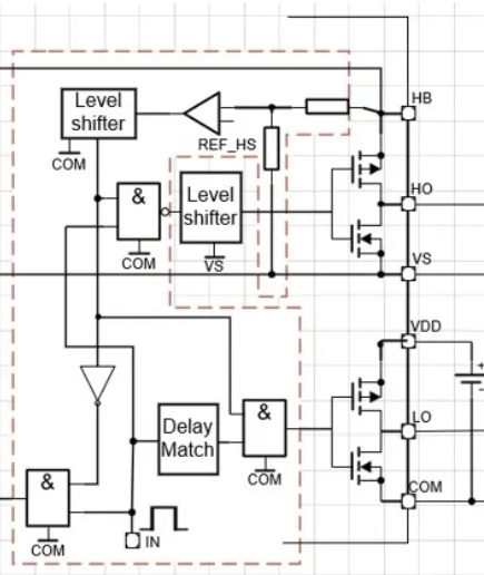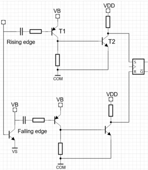 控制信号的电平移位器任务是将电平参考点从浮动点VS转换到系统参考点COM。由于VB相对于COM参考点是比较高的电压,为了减少晶体管的功率损耗,设计的电平移位器让晶体管仅在控制信号的上升沿或下降沿期间导通,其余时间保持关闭。因此,控制信号的上升沿和下降沿转换为两个短脉冲,这两个短脉冲作为置位和复位信号去控制RS触发器,触发器输出再现原始控制信号的电平状态。