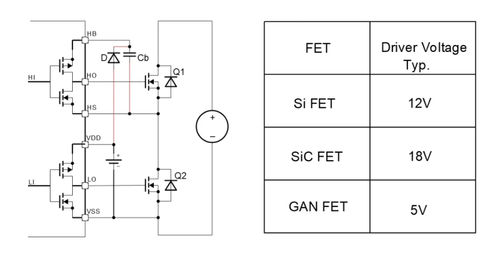 半桥功率级常因高边和低边驱动器之间的非对称开关而面临挑战。图1展示了传统的自举电路驱动方式,该电路在低边导通期间通过一个二极管给电容器(Cb)充电,从而为高边驱动器提供电源。然而,Cb需要足够的充电时间才能达到场效应晶体管(FET)的驱动电压。表格显示了不同FET所需的驱动电压。
