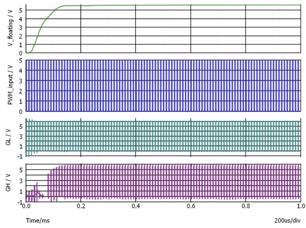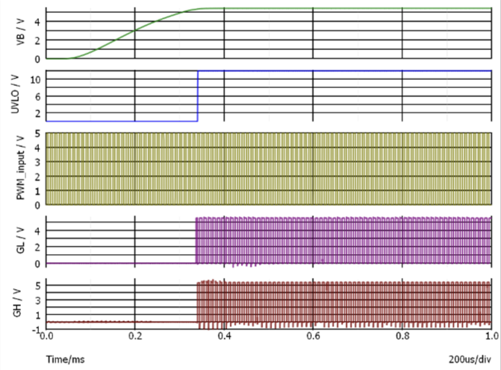 图4显示了仿真电路和详细波形。VB用作高边驱动器的电源,设计用于驱动栅极电压为5V的GaN晶体管。UVLO配置为在4.5V时触发,具有0.5V的滞后范围。GL和GH分别代表高边和低边推挽驱动器的输出,在驱动晶体管的正确电压水平下实现对称开关。