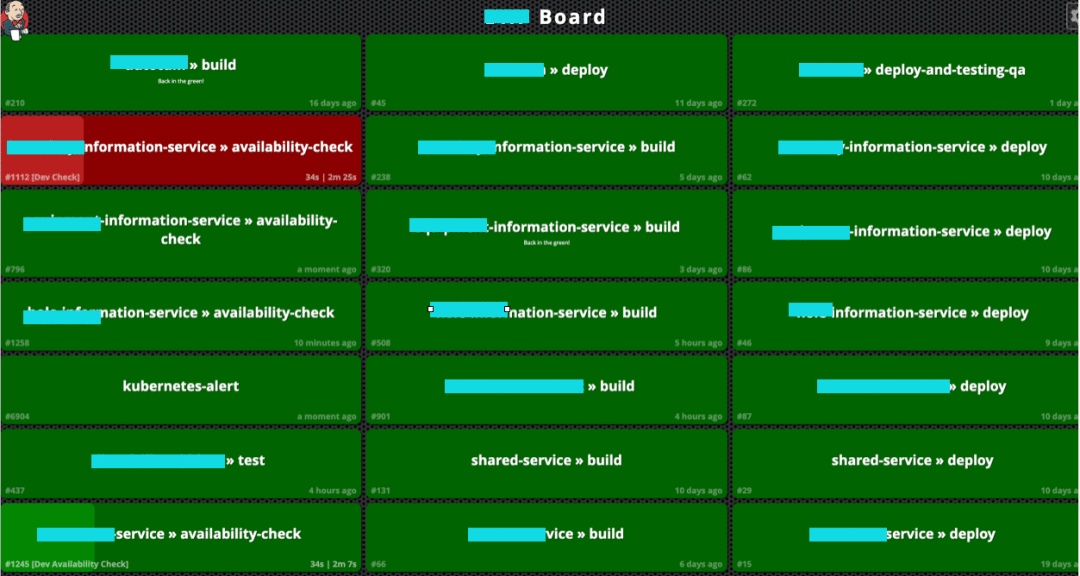 项目上用的是Jenkins自带的 Build Monitor View。将对项目pipeline的监控投影到电视上,并配置相应的提示音,能非常及时地让团队知道最新的构建,部署,测试状态。