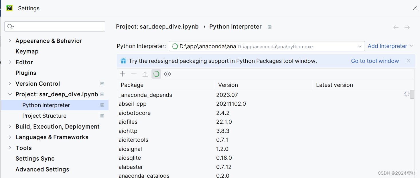 安装好后打开pycharm的setting,将anaconda的python解释器添加进来并使用。