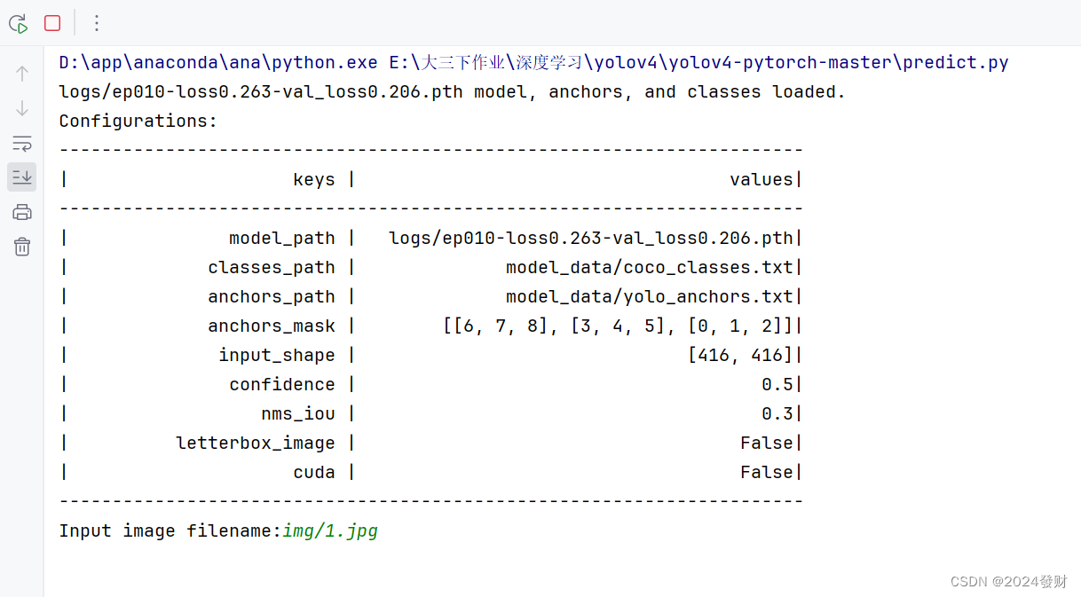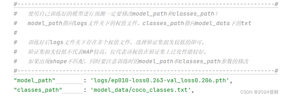 预测准确可以使用get_map.py文件计算性能指标,先打开yolo.py文件设置model_path地址填入logs下训练好的loss模型,例如我下图的ep010-loss0.263-val_loss0.206.pth。classes_path与训练和预测的一致即可。