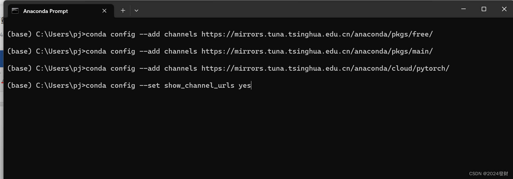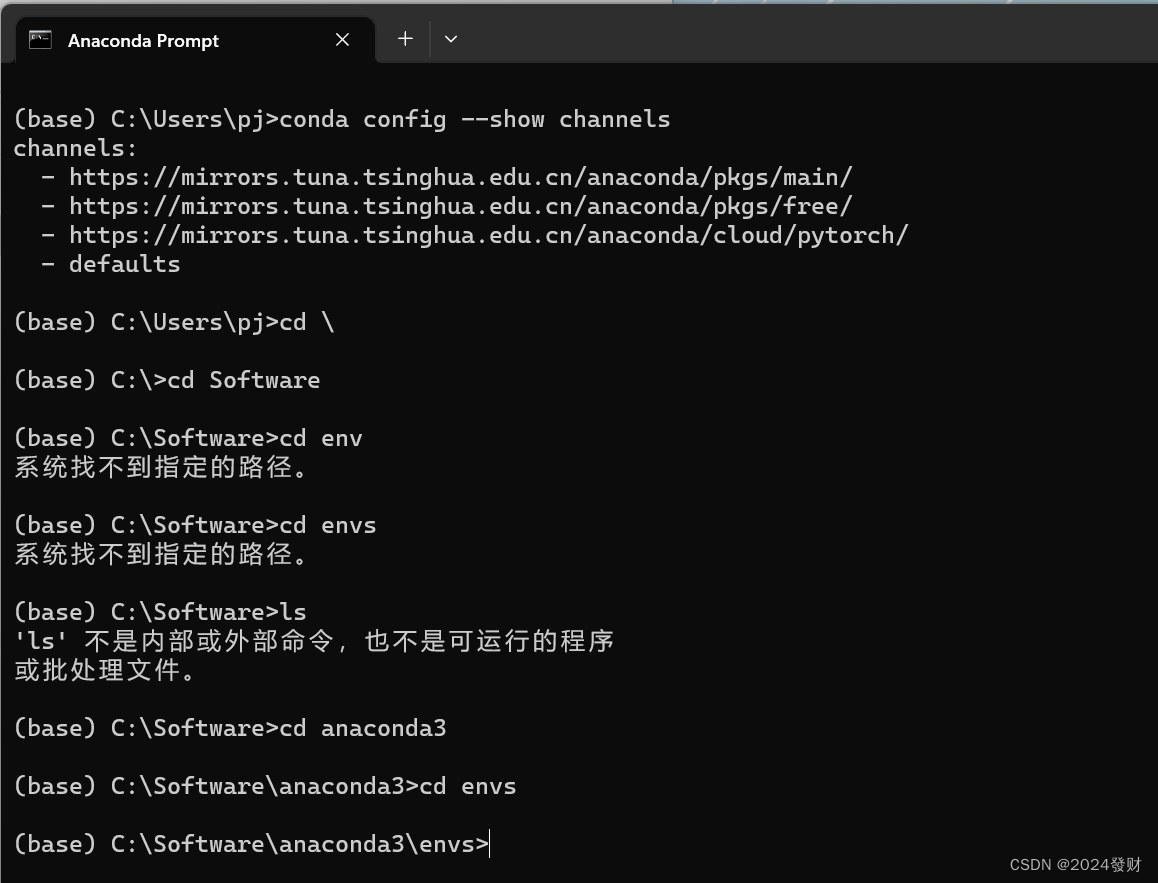 在Anaconda Prompt命令行依次输入以下四条命令切换到清华镜像源(先切换镜像源为国内清华镜像源,这样安装包的时候下载速度会快一些,也容易成功一些。)切换镜像源为非必要操作