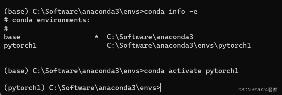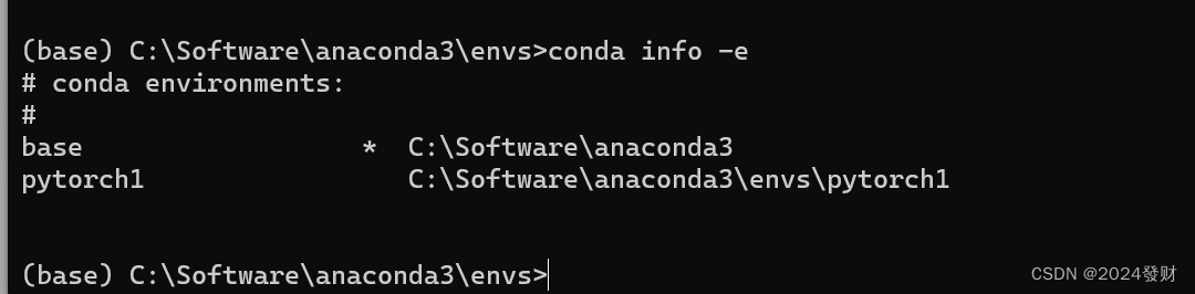 输入以下命令来查看已有的Conda环境信息,可以看到pytorch环境已经添加成功了