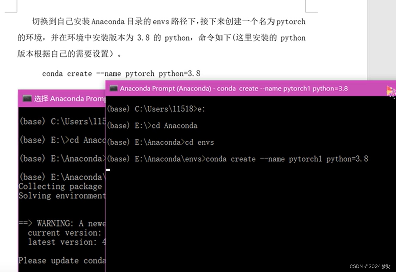 切换到自己安装Anaconda目录的envs路径下,接下来创建一个名为pytorch的环境,并在环境中安装版本为3.8.5 的 python,命令如下(这里安装的 python版本根据自己的需要设置)。