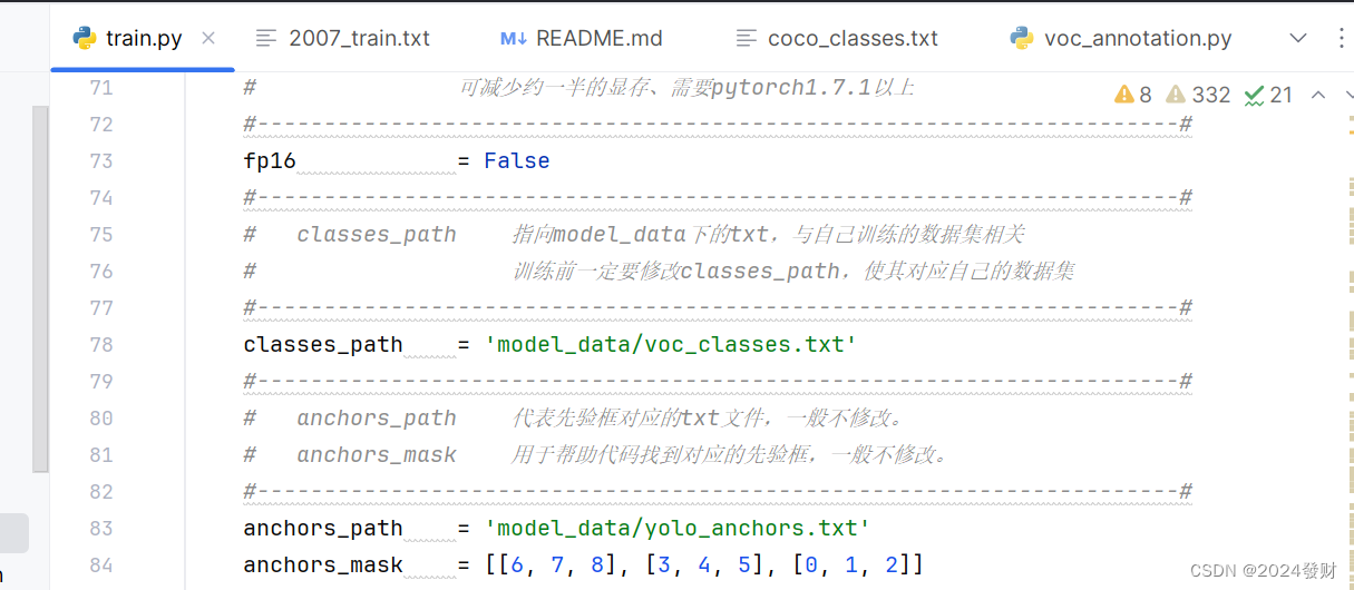 在完成数据集的摆放之后,我们需要利用voc_annotation.py获得训练用的2007_train.txt和2007_val.txt。 修改voc_annotation.py里面的annotation_mode=2,第一次训练可以仅修改classes_path,classes_path用于指向检测类别所对应的txt。 运行voc_annotation.py生成根目录下的2007_train.txt和2007_val.txt。