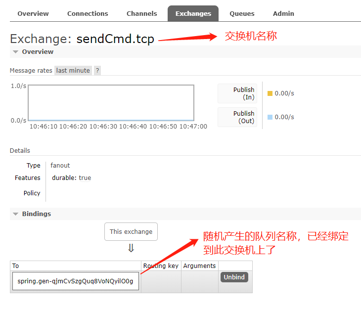 消费者声明一个系统产生的随机队列绑定到这个交换机上,然后往交换机发消息,只要绑定到这个交换机上都能收到消息,关键代码如下: