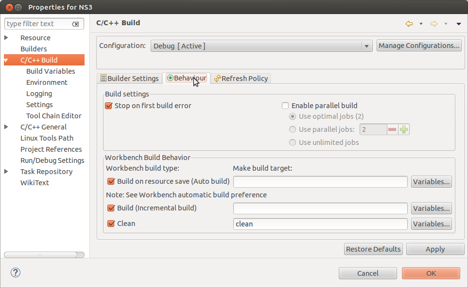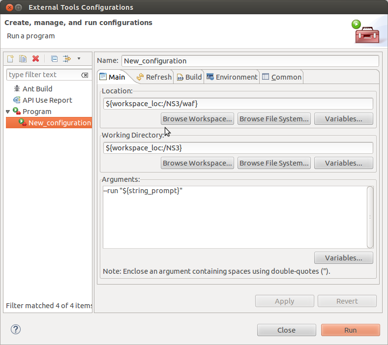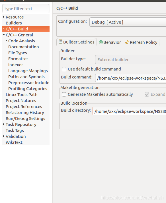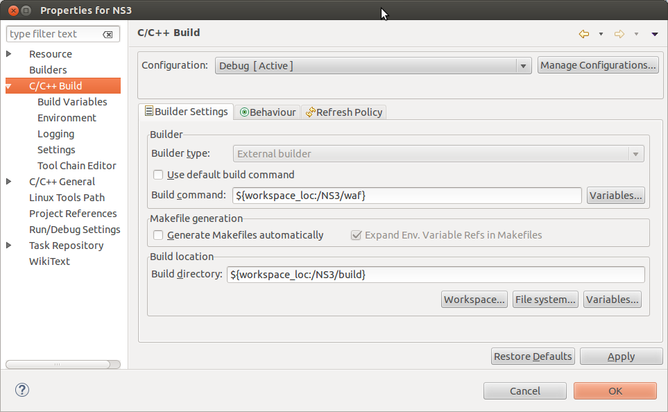 并在 build command 中输入workspaceloc:/NS3/waf;或者这种绝对路径(我用的绝对路径)/home/xxx/eclipse-workspace/NS3/waf 当${workspaceloc:}这种不好使的时候 下述都可以改成这种绝对路径