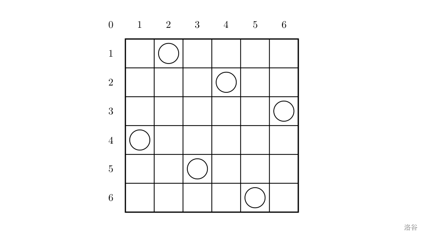 上面的布局可以用序列 2 4 6 1 3 5 来描述,第 i 个数字表示在第 i 行的相应位置有一个棋子,如下: