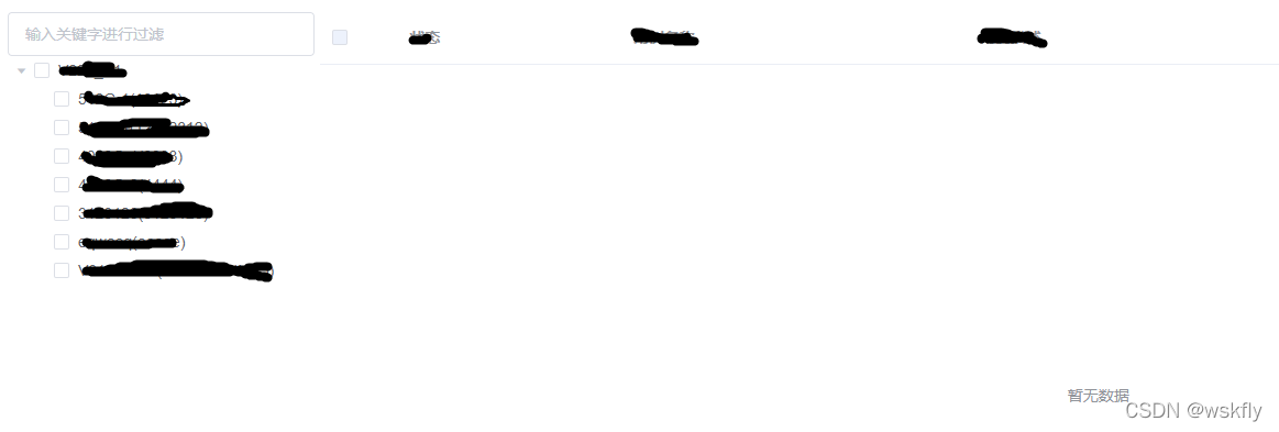 先上效果图,这里打码不影响效果和实现, 我这里表格的数据是点击树的node后触发向后台数据请求,这里刚进来就没有数据。